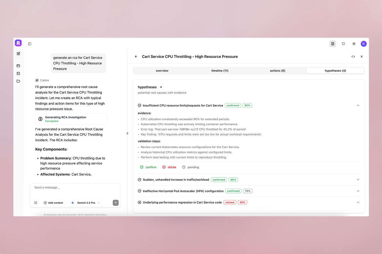 Instead of chasing one theory at a time, Calmo pursues multiple hypotheses simultaneously and validates each against real evidence from your production systems. Move from symptoms to root cause in minutes.